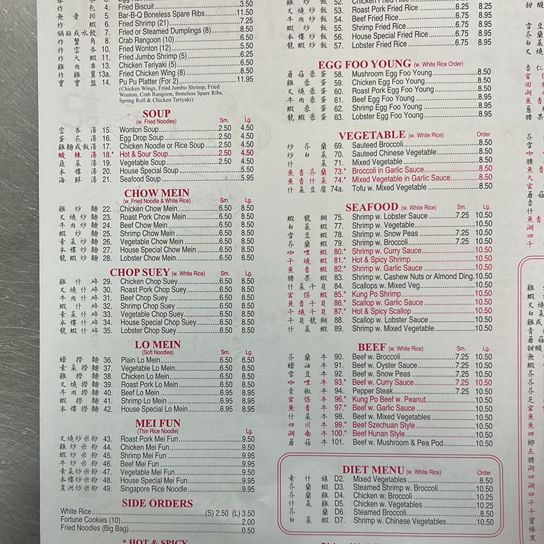 “ On July 3rd I called in an order for Bourbon Chicken combo, Mandrian Triple Crown and 2 extra egg rolls. The total cost was 26.19. The food was all very good and the portions were large. The food was ready when I arrived in 10 minutes. I have always had a good experience with China King ”